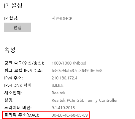 - 예) 00-E0-4C-68-05-E9 → 00-E0-4C 제조사 코드, 68-05-E9 제조업체가 부여한 일련번호