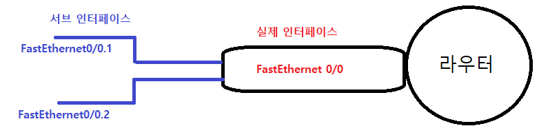※ 서브인터페이스란? 인터페이스 하나를 다시 작게 나눈 것을 말한다. 하나의 인터페이스를 왜 다시 나누느냐? 그건 바로 지금처럼 VLAN 을 쓸 때 사용하기 위해서임. 라우터는 스위치의 트렁크 포트와 연결되어 있고 스위치의 트렁크 포트를 통해 라우터로 들어오는 VLAN은 2개임. 따라서 겉으로는 하나지만 내부적으로는 두 개의 인터페이스가 있어야 각각의 VLAN에 대한 라우팅을 해줄 수 있는 것임.