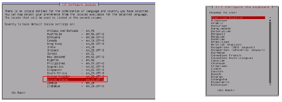 step3> 데비안 리눅스의 터미널(CLI) 환경에서 사용되는 언어를 선택합니다. 한글로 선택 할 경우 한글이 지원되지 않는 터미널에서 문자가 깨지는 현상이 나타나기 때문에 가급적 영어로 선택을 추천합니다. 오른쪽은 키보드 배열을 선택하며 “American English” 키맵을 사용합니다.