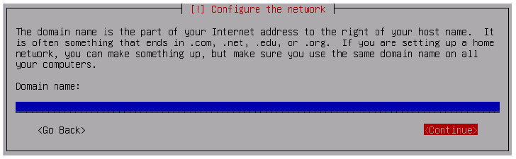 step6> 서버가 소속된 도메인명을 입력합니다. 네트워크가 없는 상태에서는 나타나질 않습니다. 입력하지 않고 진행하도록 하겠습니다.(설치 완료 후 변경)