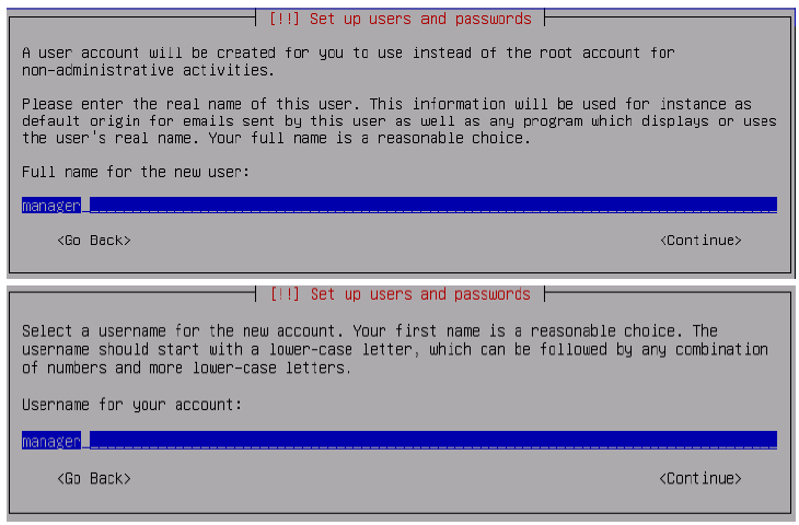 step8> ‘root’ 사용자의 권한을 위임받아 시스템을 관리할 사용자를 추가합니다. 리눅스의 최고 관리자인 ‘root’는 시스템 전체에 대하여 막강한 권한을 가지고 있기 때문에 잘못된 명령을 수행하면 시스템에 치명적인 손상을 초래할 수 있기 때문에 ‘root’의 권한을 위임받은 사용자로 하여금 ‘sudo’ 명령어를 이용하여 시스템을 컨트롤할 수 있도록 합니다. user name과 password를 manager 로 설정하겠습니다. 사용자 이름과 비밀번호를 두 번 입력합니다.