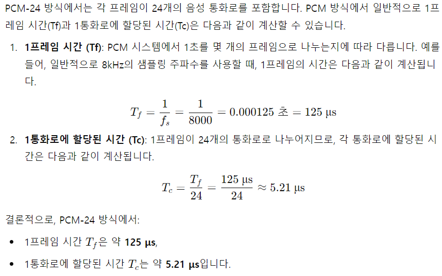 Q> PCM-24 방식에서 1프레임 시간(Tf)과 1통화로에 할당된 시간(Tc)은 얼마인가?