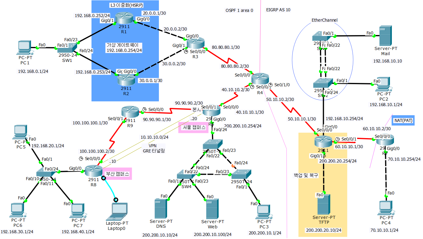 조건>> 토폴리지와 같이 OSPF 1 Area 0, EIGRP AS 10 라우팅 프로토콜을 적용하고 재분배 하시오.